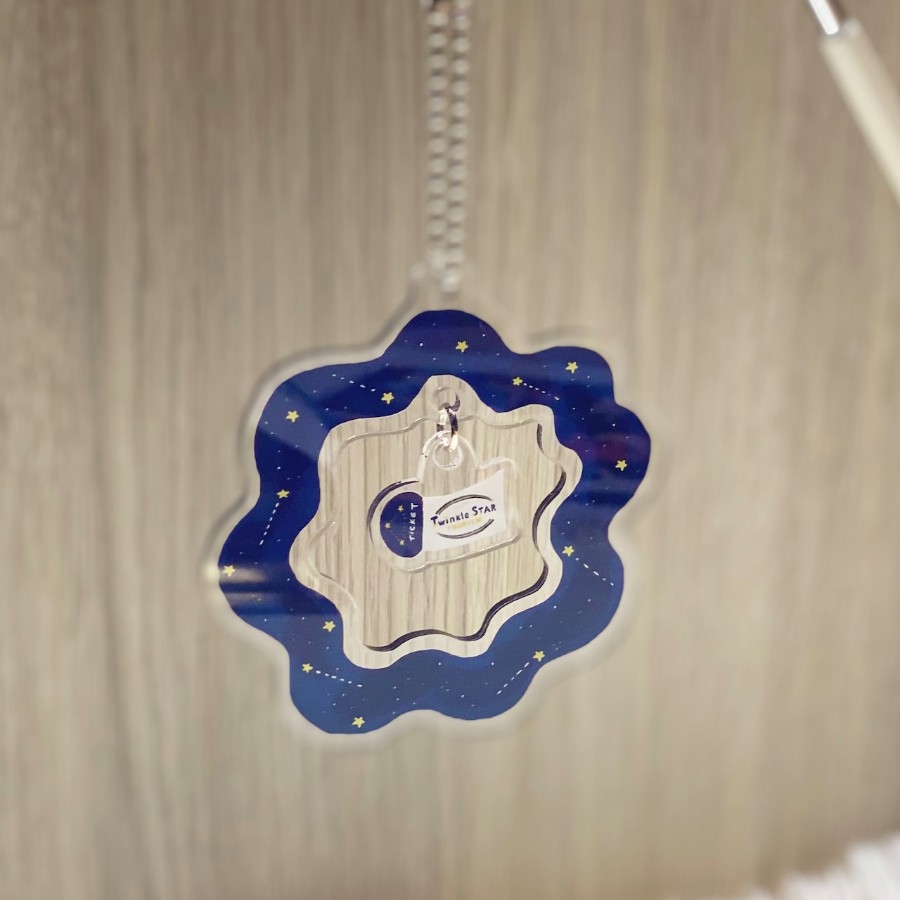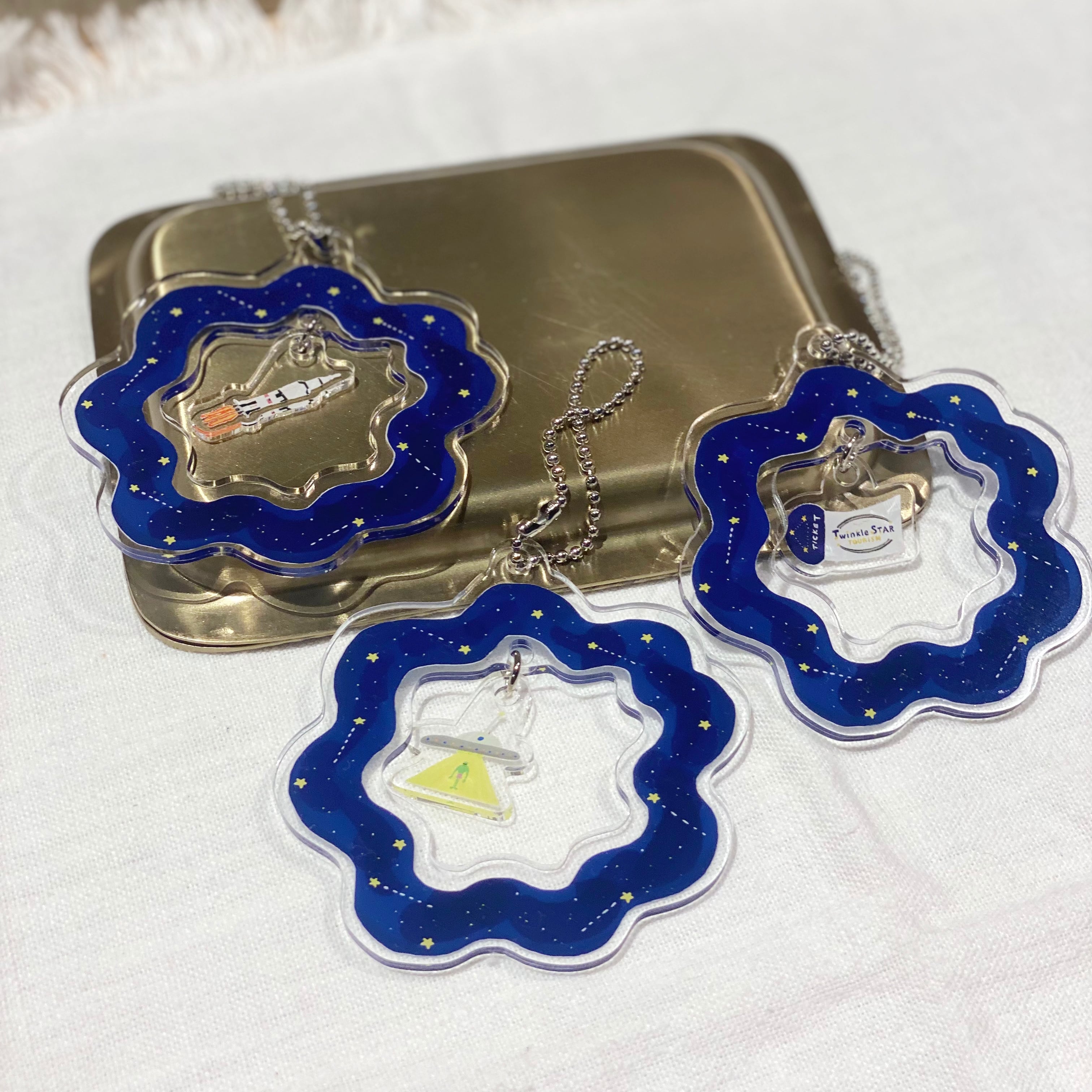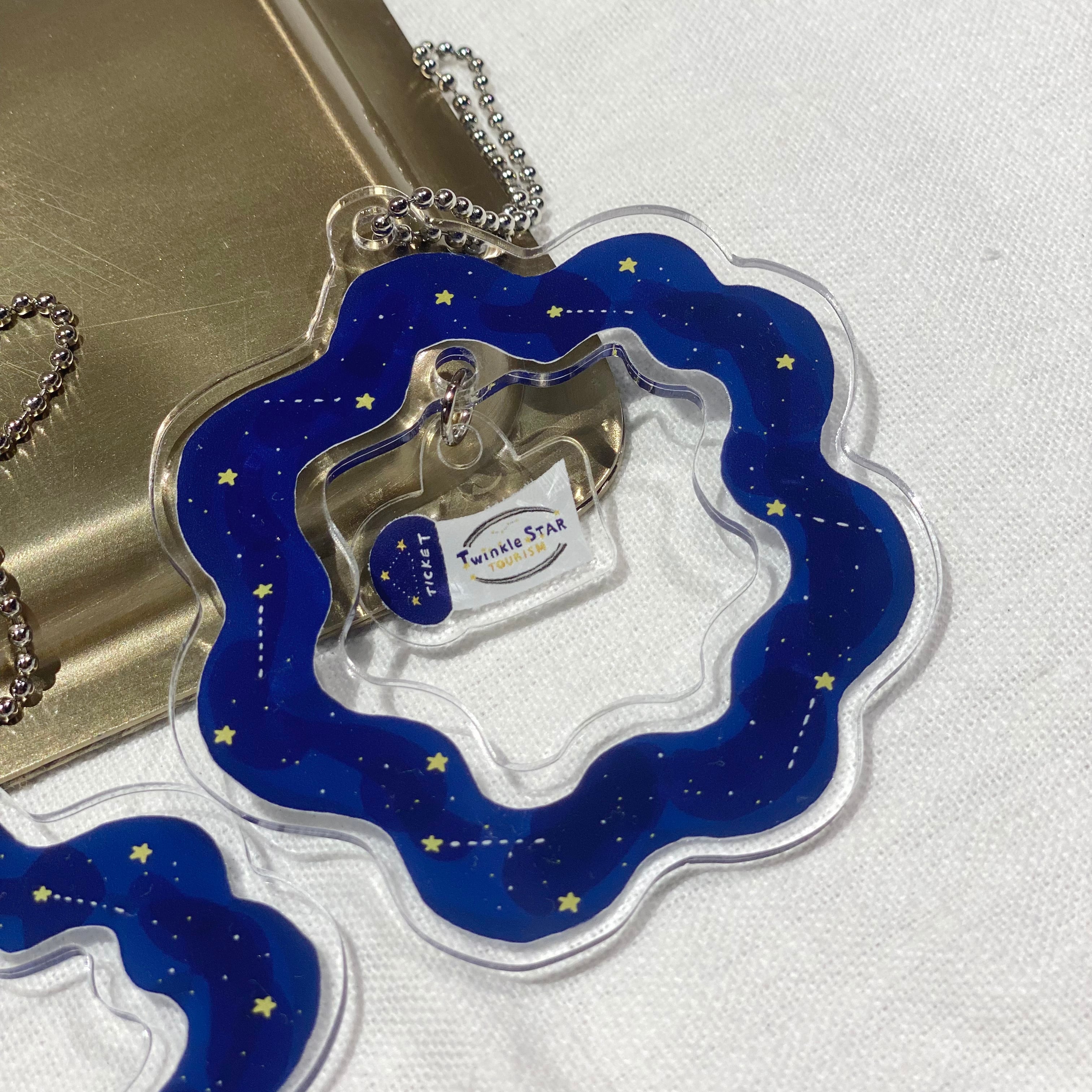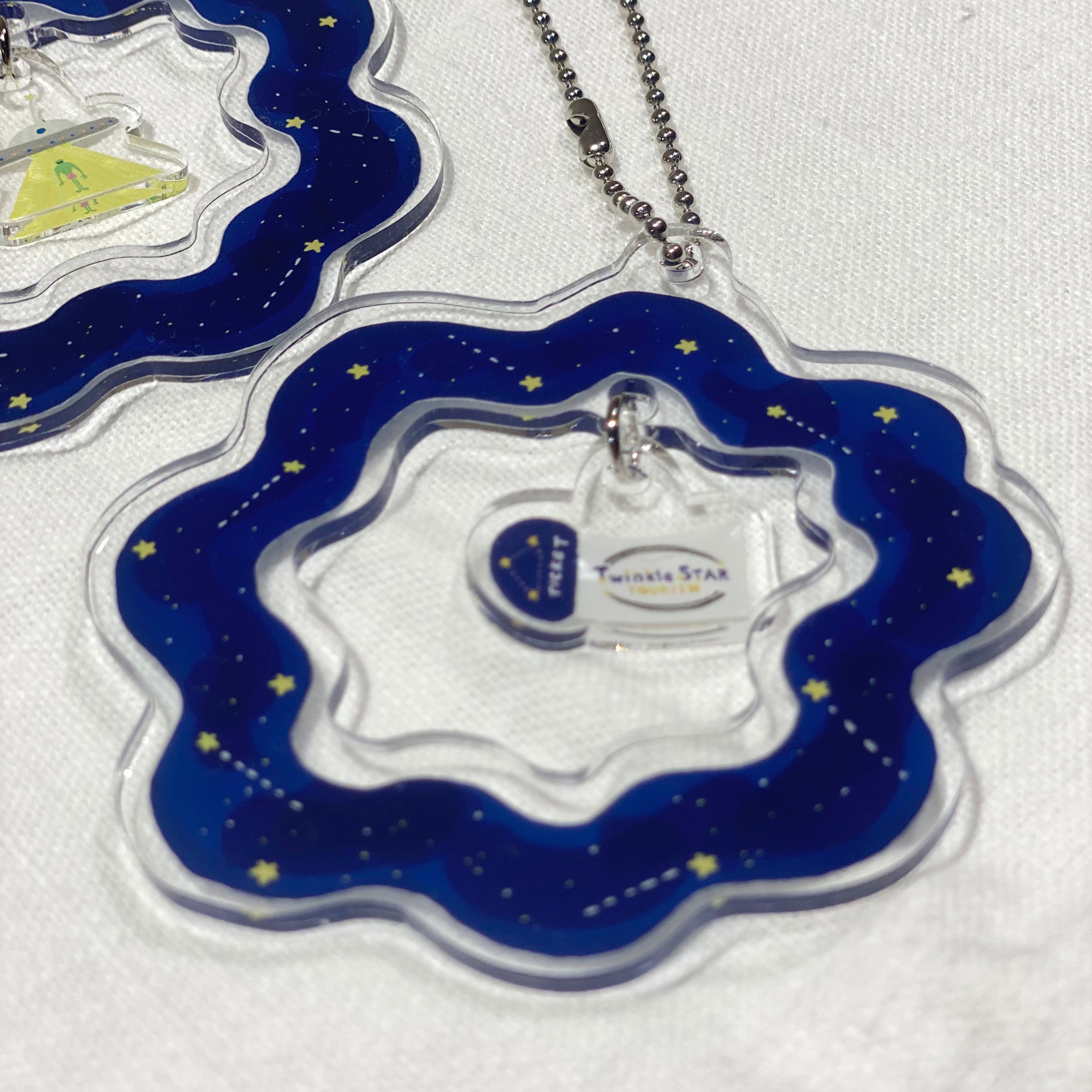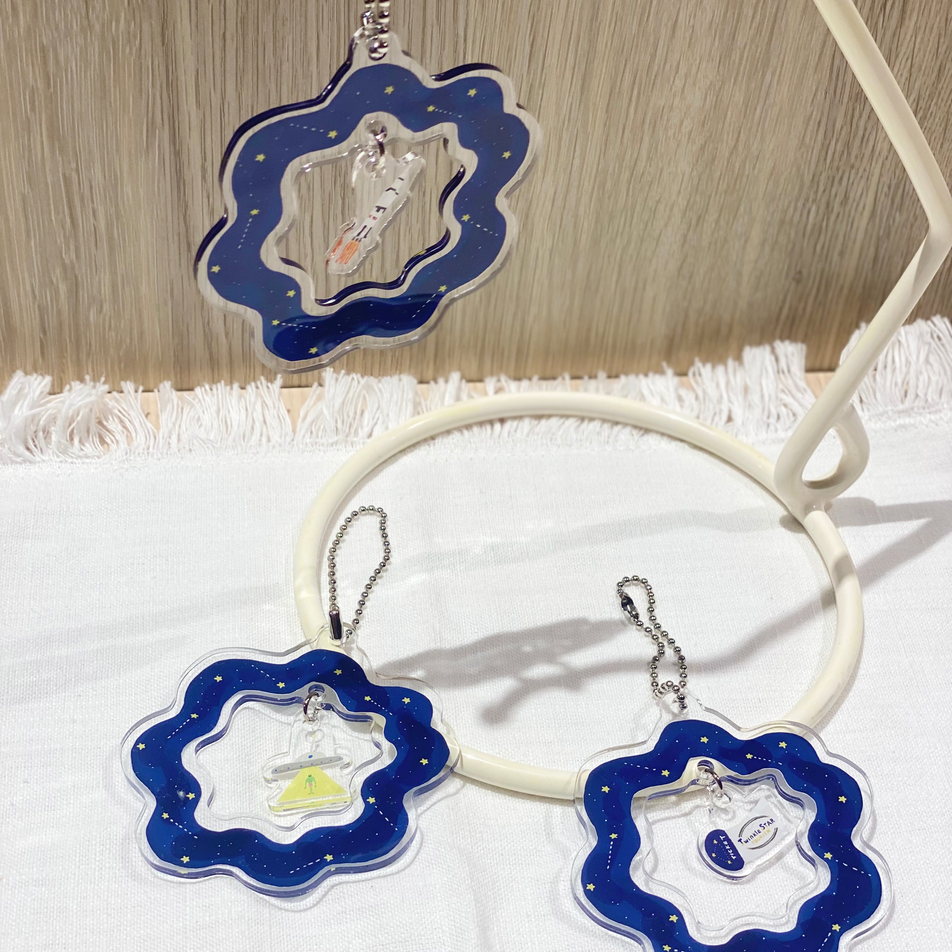 宇宙が広がるキーホルダーの真ん中に宇宙船が